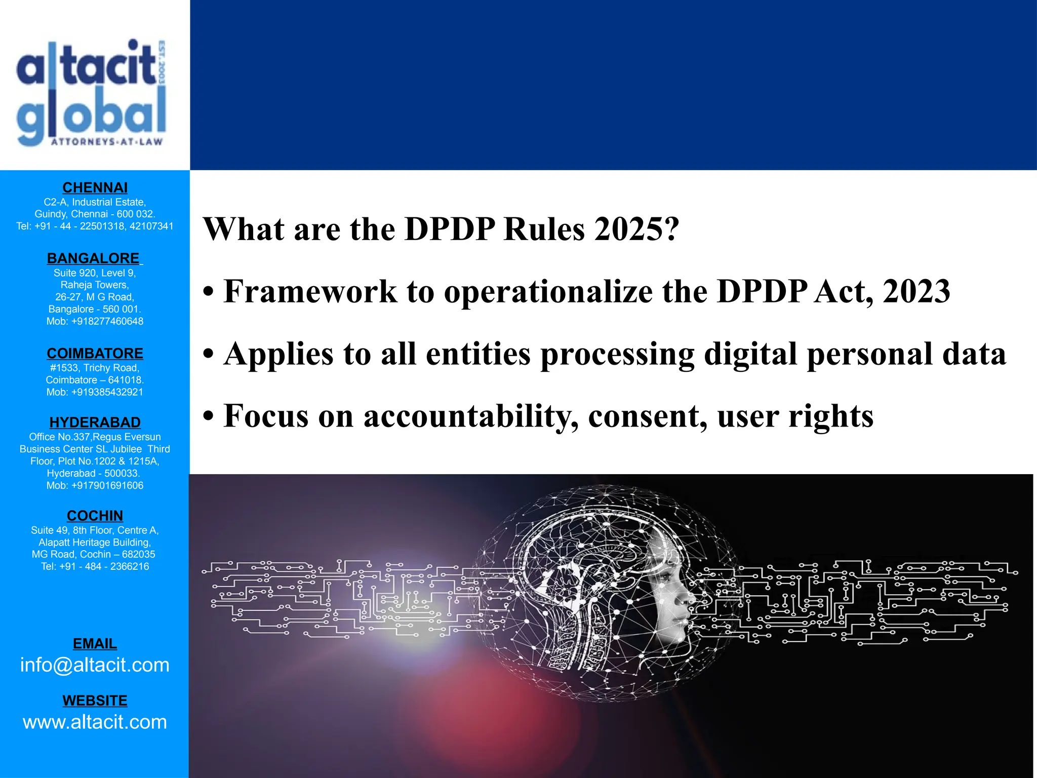 • DPDPA, 2023, enforces consent and data minimization but allows government