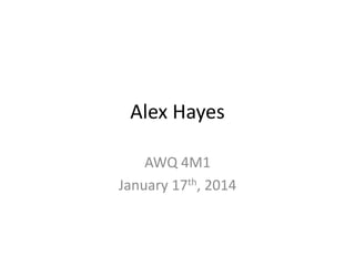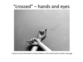 This document contains 7 photographs taken by Alex Hayes along with a brief 1-2 sentence description of the artistic intent or technique used for each photo. The photos include "crossed" showing emotion in hands, "branches over water" capturing depth with a water reflection, and "flame" contrasting a bright flame against a dark background.