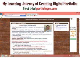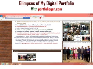 The document outlines the author's learning journey in creating a digital portfolio, beginning with portfoliogen.com and progressing to livebinders.com, which significantly influenced their perspective. It discusses how the digital portfolio addresses various learner goals, curriculum coverage, knowledge transfer processes, and self-reflection. Additionally, it reflects on the transformative impact of an M.Tech in educational technology on the author's life.