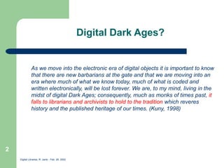 The document discusses challenges and strategies for digital preservation. It outlines a life cycle approach to digital archiving including metadata, storage, access, and preservation strategies like migration. Examples of digital preservation projects at Rutgers University are provided, such as databases of historical information and digital collections. Ensuring long-term access to digital content requires standards, documentation, addressing technology obsolescence, and establishing trusted digital repositories.