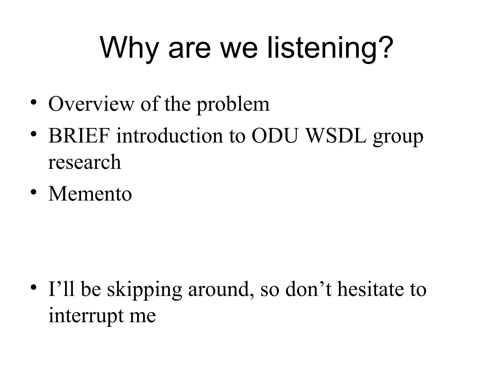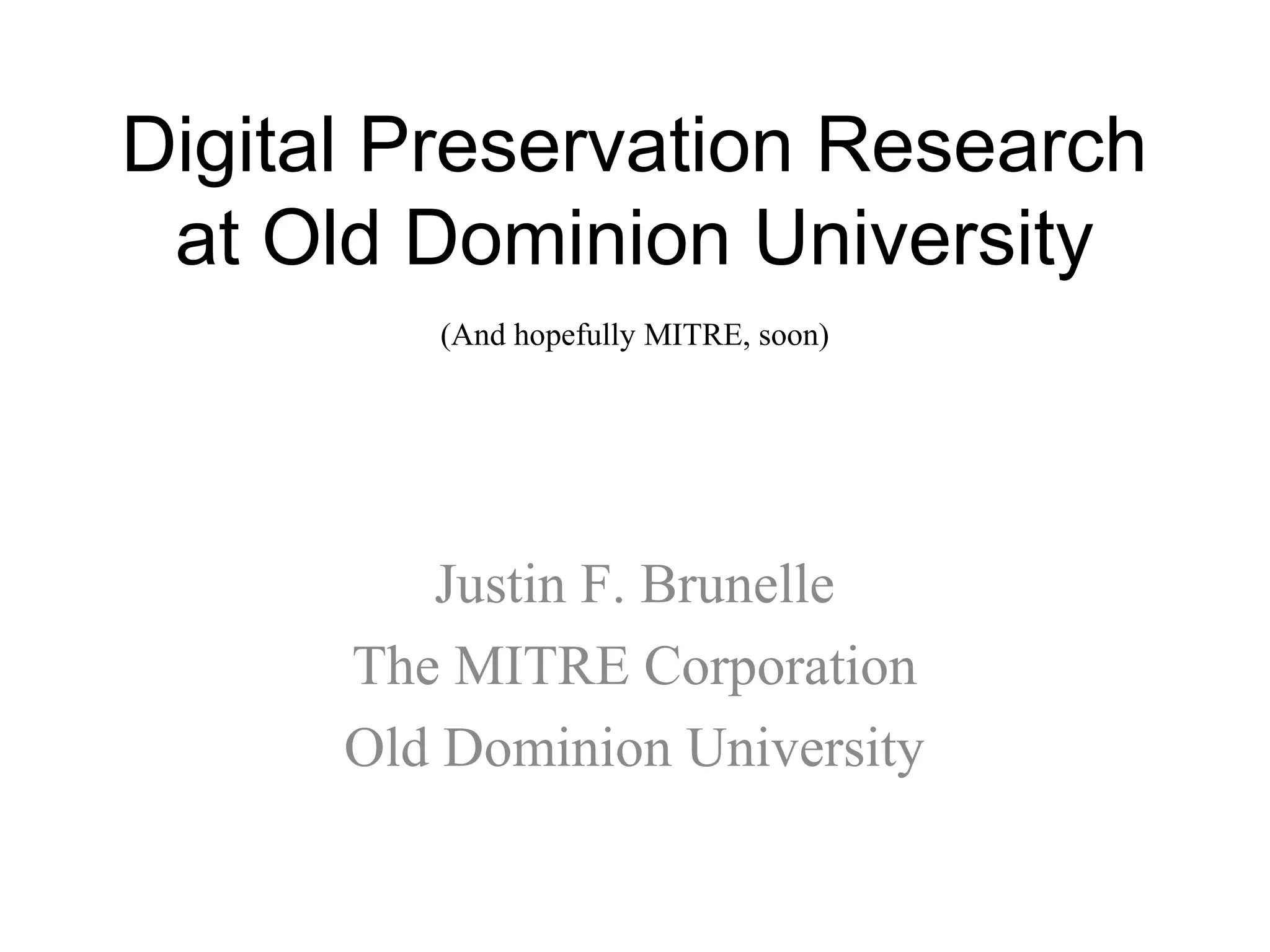 The document discusses digital preservation research at Old Dominion University, focusing on the challenges of preserving web content and the concept of 'temporal browsing.' It highlights the Memento project, which aims to integrate the current and past web, making it easier to navigate archived resources through a protocol-based system. Various preservation strategies are examined, such as lazy and just-in-time preservation, emphasizing the need for innovative approaches to maintain web content accessibility over time.