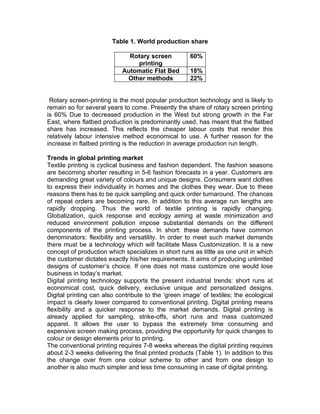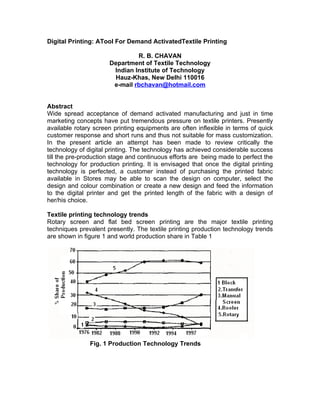 Digital printing offers several advantages over conventional analog printing methods for textiles. It allows for mass customization and quick turnaround due to minimal press setup times. Digital printing can change color schemes or designs in real time during production. It also produces less waste and has a lower environmental impact than screen printing. However, digital printing has lower throughput than analog methods and higher costs for long runs. It also requires specially coated substrates and has limitations in ink color options and opacity.