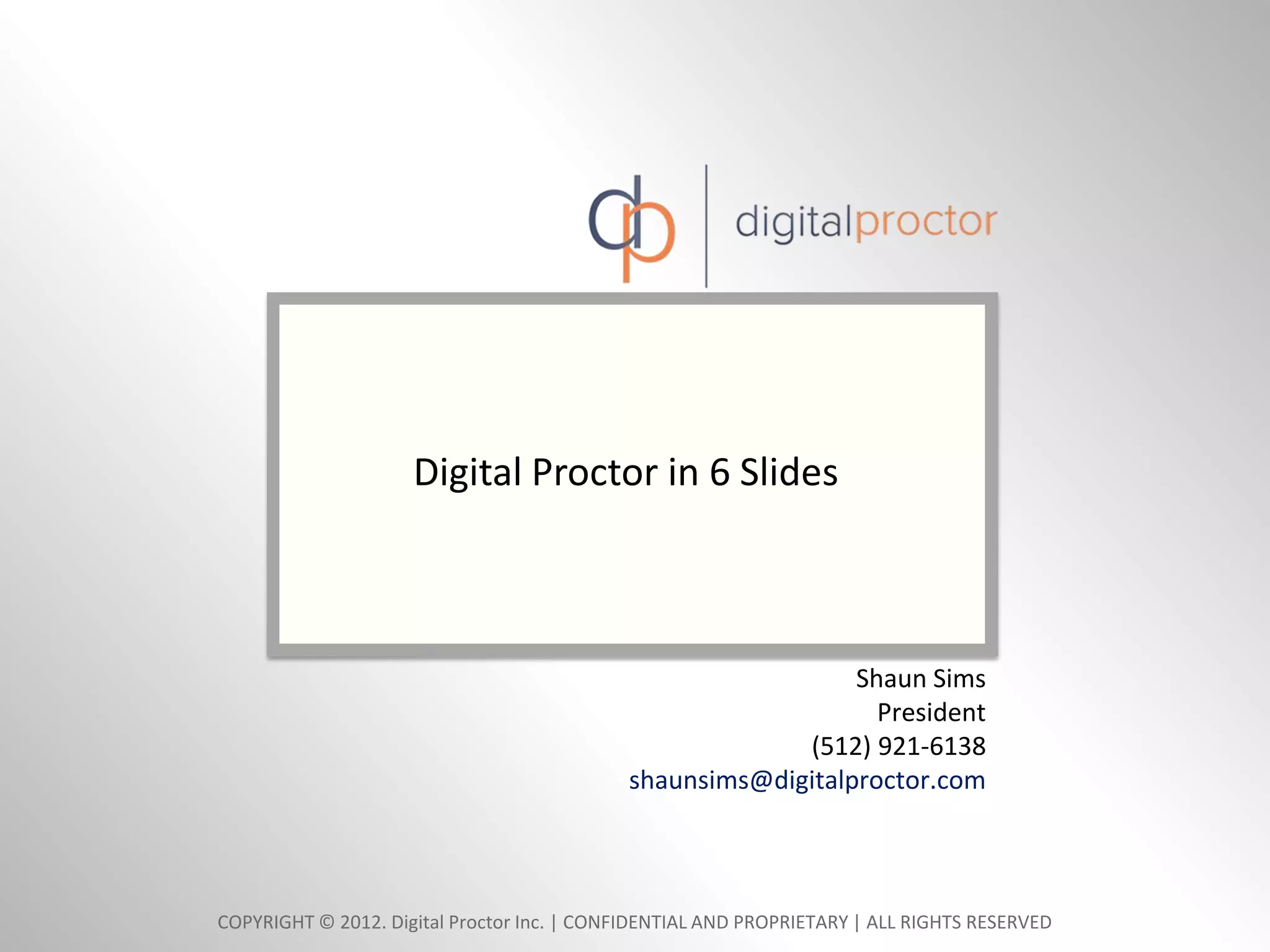 Digital Proctor is a company that helps schools verify student identity to comply with Department of Education requirements. It was founded in 2009 and has since collected over 15 million data points from some of the largest institutions. The company uses 14 technologies like IP tracking, pixel mapping, and typing biometrics to detect identity fraud during online exams and financial aid applications. It provides real-time reports and has clients such as large universities and testing organizations.