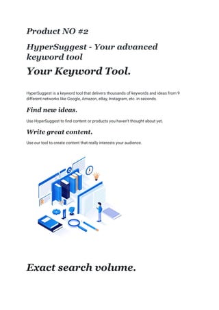 The document presents three products related to YouTube automation and keyword research. Product #1 helps set up a YouTube automation business quickly, while Product #2, Hypersuggest, is an advanced keyword tool that generates keyword ideas and insights across various platforms. Product #3 is a comprehensive YouTube program offering extensive training on monetization and automation strategies without showing the creator's face.