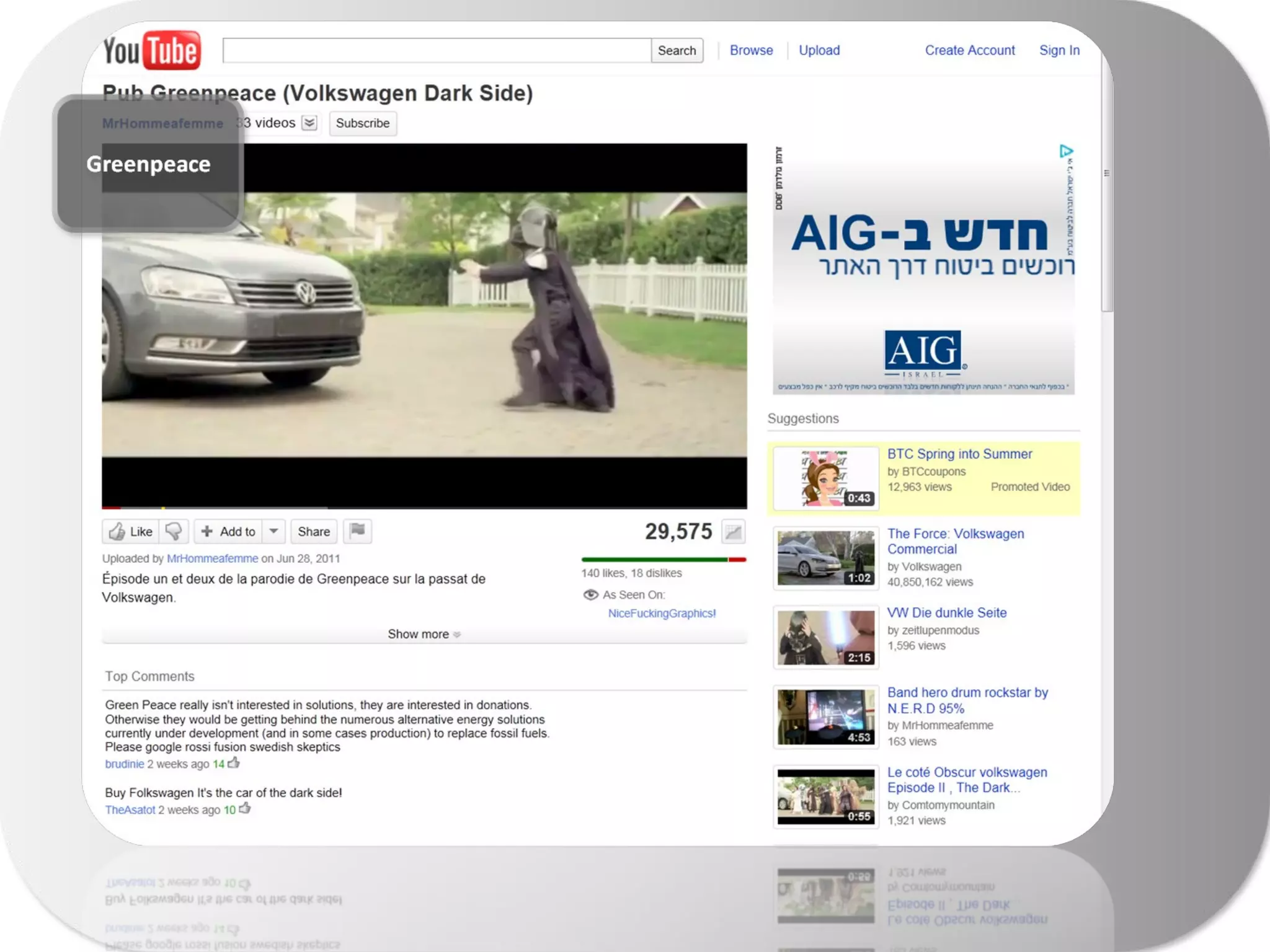 גרינפיס נגד פולקסוואגן גרינפיס יצאה בקמפיין השמצה כלפי הרכבים של פולקסוואגן , שלטענתה מזהמים את האוויר . מה שחדש במהלך הוא הטייק - אופ שהיא ערכה על אחד מסרטי הפרסומת המבריקים שפולקסוואגן השיקה בהשראת הסרט מלחמת הכוכבים . הרכיבה על הקמפיין הקיים יצרה באז מאוד רציני והעלתה בצורה ניכרת את המודעות לבעיית זיהום האוויר