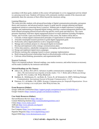 This document outlines the syllabus for CMAT 445-001—Digital PR taught by Dr. Vinita Agarwal. The course will teach principles of digital communications management and their application. It is a 4-credit, web-enhanced course that meets Tuesday/Thursday from 9:30-10:45AM. Assignments include a month-long micro-campaign addressing a campus issue using 2 digital networks, an issue analysis research paper, digital class participation on Twitter, case studies presented on Wordpress and YouTube, and exams on Google Analytics and AdWords. The course aims to provide an in-depth understanding of digital PR strategies and build skills in audience engagement, evaluation, strategy, and project management.