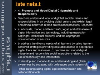 Teachers have a responsibility to promote digital citizenship and model appropriate behavior online. This includes advocating for safe, legal, and ethical technology use; providing equitable access to digital tools and resources; promoting digital etiquette; and developing global awareness through online collaboration. As more people interact in virtual spaces, issues of rights, responsibilities, and governance become increasingly important. While censorship and abuse are problems online, establishing clear rules of digital citizenship could help balance individual rights and the needs of the broader community in the digital world.