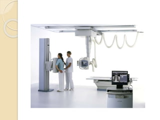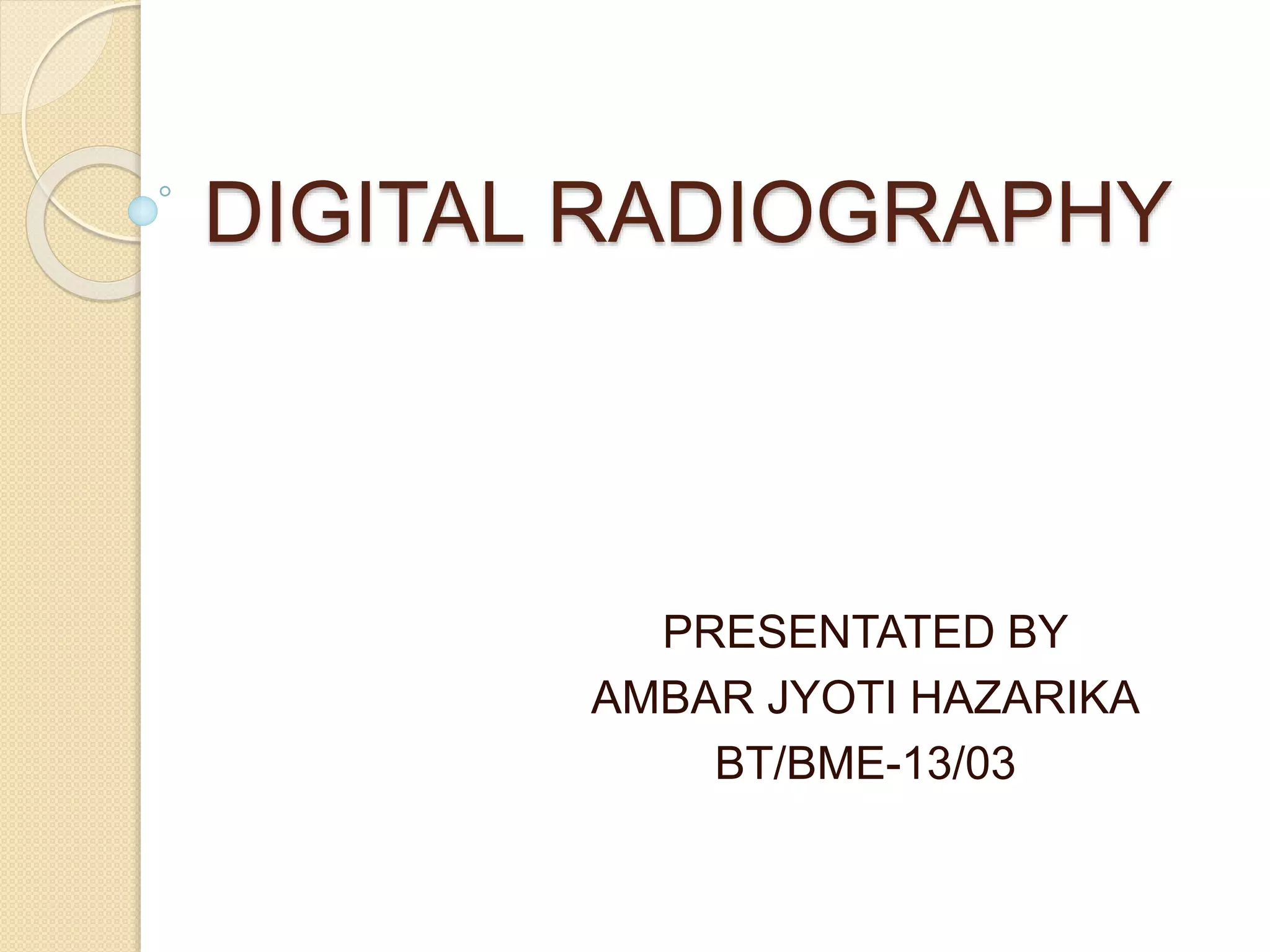This document provides an overview of digital radiography. It discusses the history, general principles, detectors, advantages, and disadvantages of digital radiography. Digital radiography was first developed in 1980 and makes radiographic images digitally stored and viewable on computers. The document focuses on the two main types of detectors used: flat panel detectors and high-density line-scan solid state detectors. Flat panel detectors can be indirect, using a scintillator, or direct, converting x-rays directly into charge. Digital radiography provides benefits like instant viewing, less radiation dose, and ability to share images digitally, but has higher costs than traditional radiography.