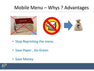 The document discusses the advantages of using a digital mobile menu app for restaurants, emphasizing benefits such as cost savings, reduced environmental impact, and improved customer satisfaction. It outlines features like vivid menus, order accuracy, and the capability to easily publish daily deals and analyze sales. Additionally, Sennovations Technologies offers a partnership for implementing mobile solutions in the hospitality industry, with a roadmap for a gradual evolution towards enhanced customer engagement and operational efficiency.