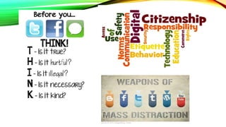 This document discusses digital rights and responsibilities. It defines digital rights and responsibilities as the privileges and freedoms extended to digital technology users, along with the behavioral expectations that come with those privileges. It then lists some key digital rights, which include rights to freedom of expression, privacy, credit for personal works, digital access, and identity. The document emphasizes that using the internet is a privilege that requires responsible behavior. It provides some technology facts and explains why digital rights and responsibilities are important for communication, knowledge, and understanding basic rights in the digital world.