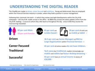 The document provides information on advertising opportunities on the CityAM.com website. It summarizes the website's audience as career-focused professionals in financial services based in London. It then details traffic growth, popular content sections, and examples of successful past advertising campaigns using banners, sponsorships, microsites and email marketing. Pricing is also included for various online advertising options.