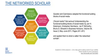 Digital scholarly practices are evolving. Researchers now have online presences and share information via social media platforms, which can increase visibility and citations. Metrics now track how research is discussed online, through mentions on platforms like Twitter. While these "alternative metrics" or "altmetrics" correlate with citations, social media discussions do not necessarily predict traditional citation impact. Altmetrics provide additional contextual information about research impact and engagement beyond citations alone.