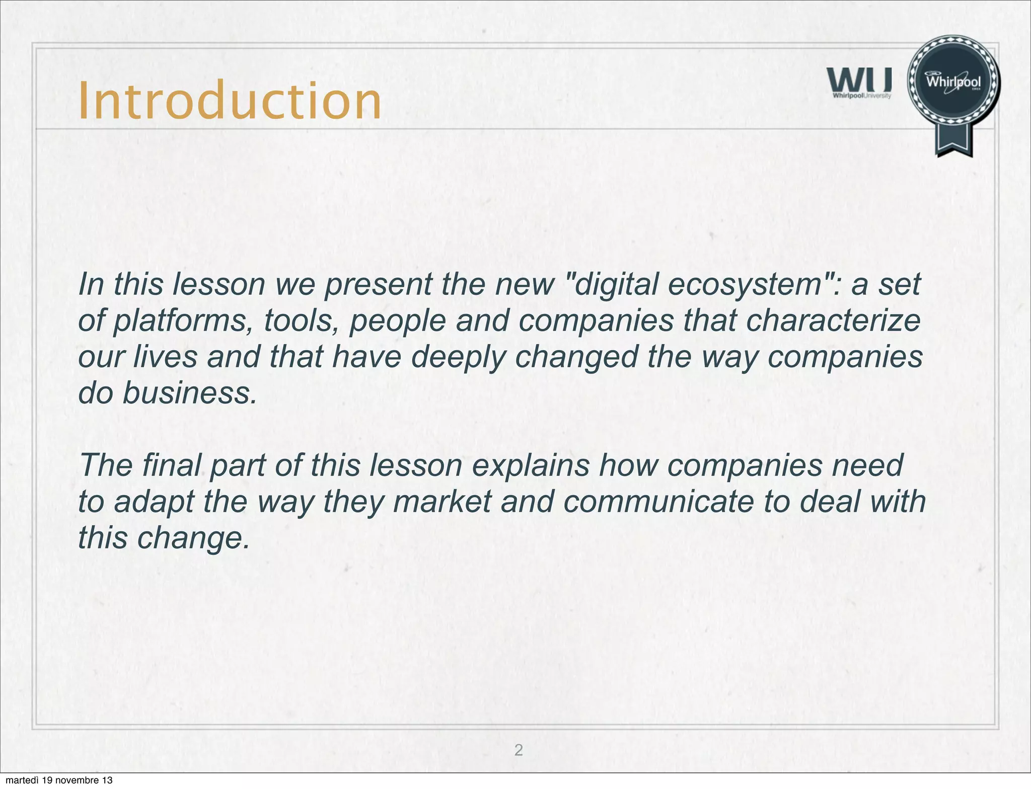 This document discusses the evolution of the digital ecosystem and its impact on marketing strategies, emphasizing the need for businesses to adapt to a fan-based engagement model in the current landscape dominated by social media. It outlines the transition from traditional media to digital platforms, highlighting the importance of integrating various channels to interact effectively with consumers throughout their journey. The conclusion advocates for creating a multilayered brand ecosystem that engages users through owned, shared, and paid media.