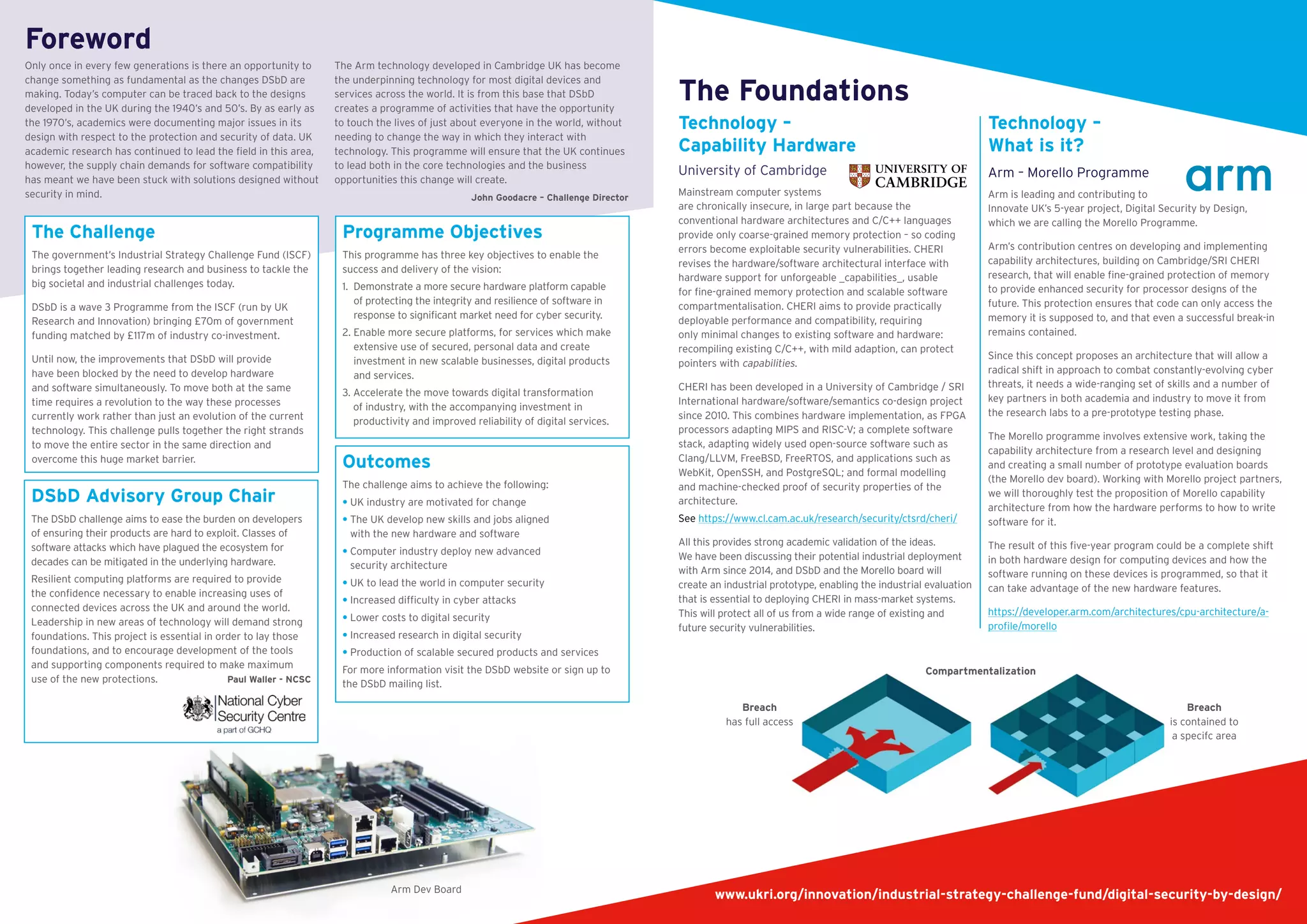 The Digital Security by Design (DSBD) initiative aims to transform the digital computing landscape by creating a secure hardware and software ecosystem supported by £70 million in government funding, complemented by £117 million from industry. The program seeks to address cybersecurity challenges by developing a more secure hardware platform and enabling the deployment of advanced security architectures, fostering innovation in digital products and services while ensuring the UK maintains a leadership role in cybersecurity. Key objectives include reducing the exploitation of software vulnerabilities, enhancing the resilience of connected devices, and advancing digital transformation across industries.