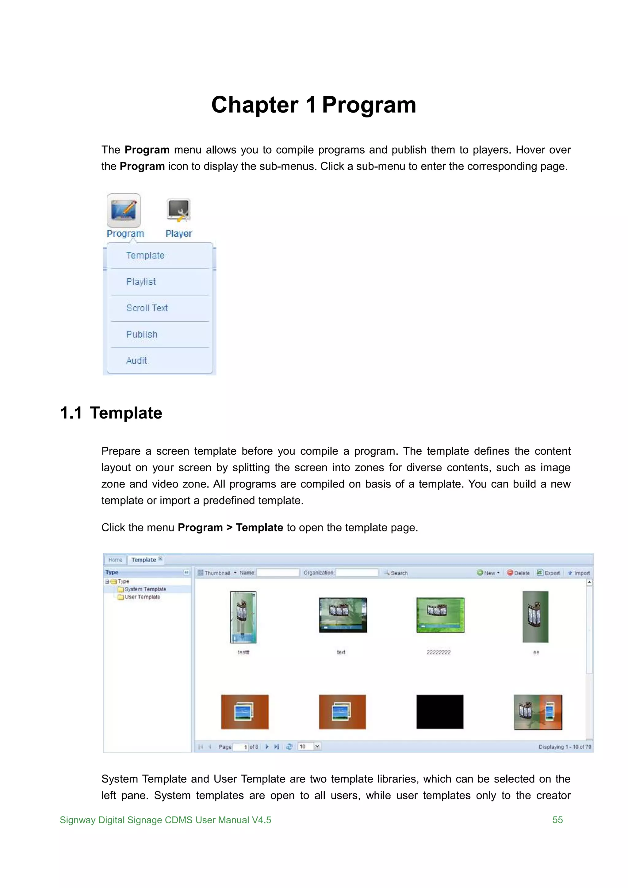 The document describes how to use a digital signage CDMS including creating templates that define content layout and zones, building playlists by adding media to zones, and publishing programs to distribute them to players. Templates split screens into content areas. Playlists add images, videos, and other files to zones in templates. Published programs are compiled and distributed over a network to digital sign