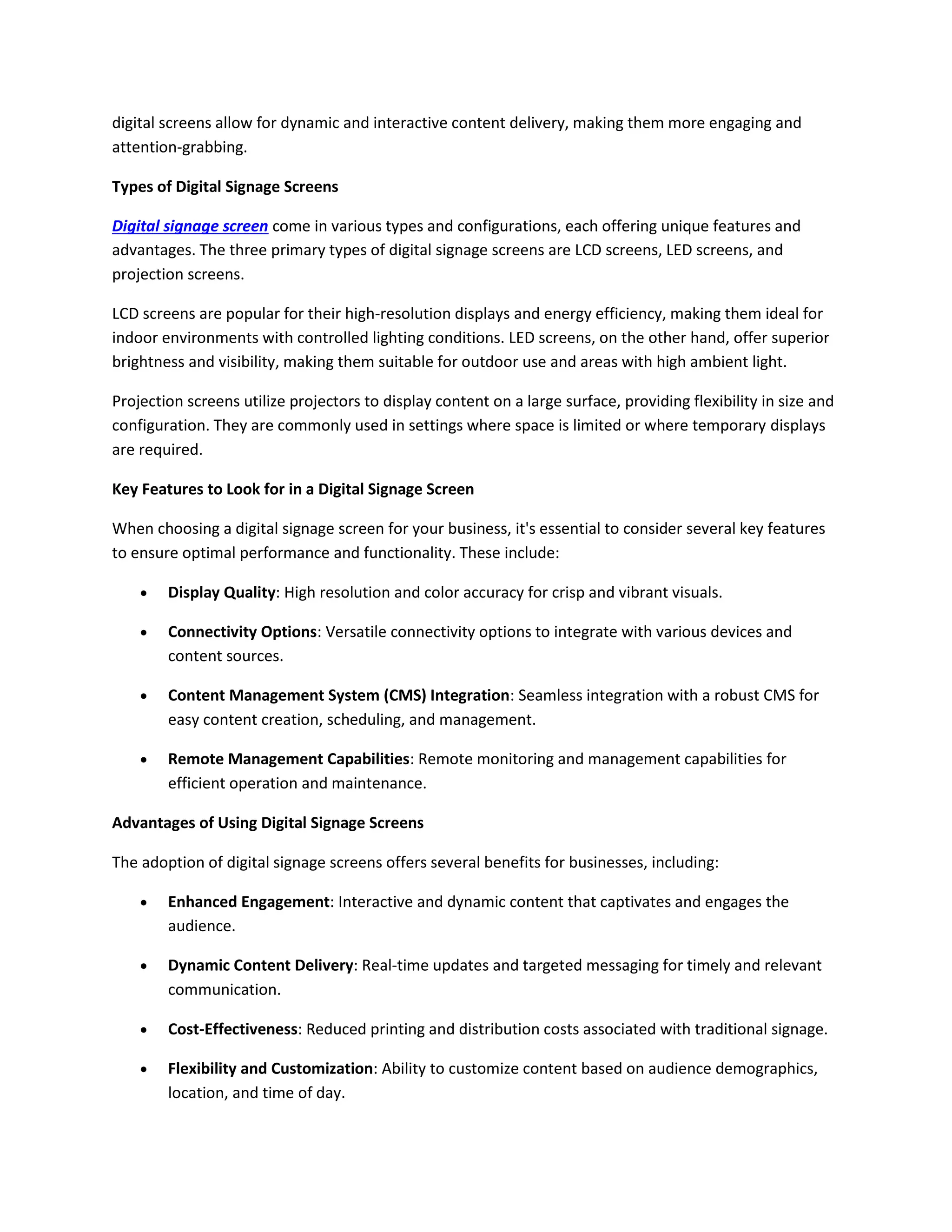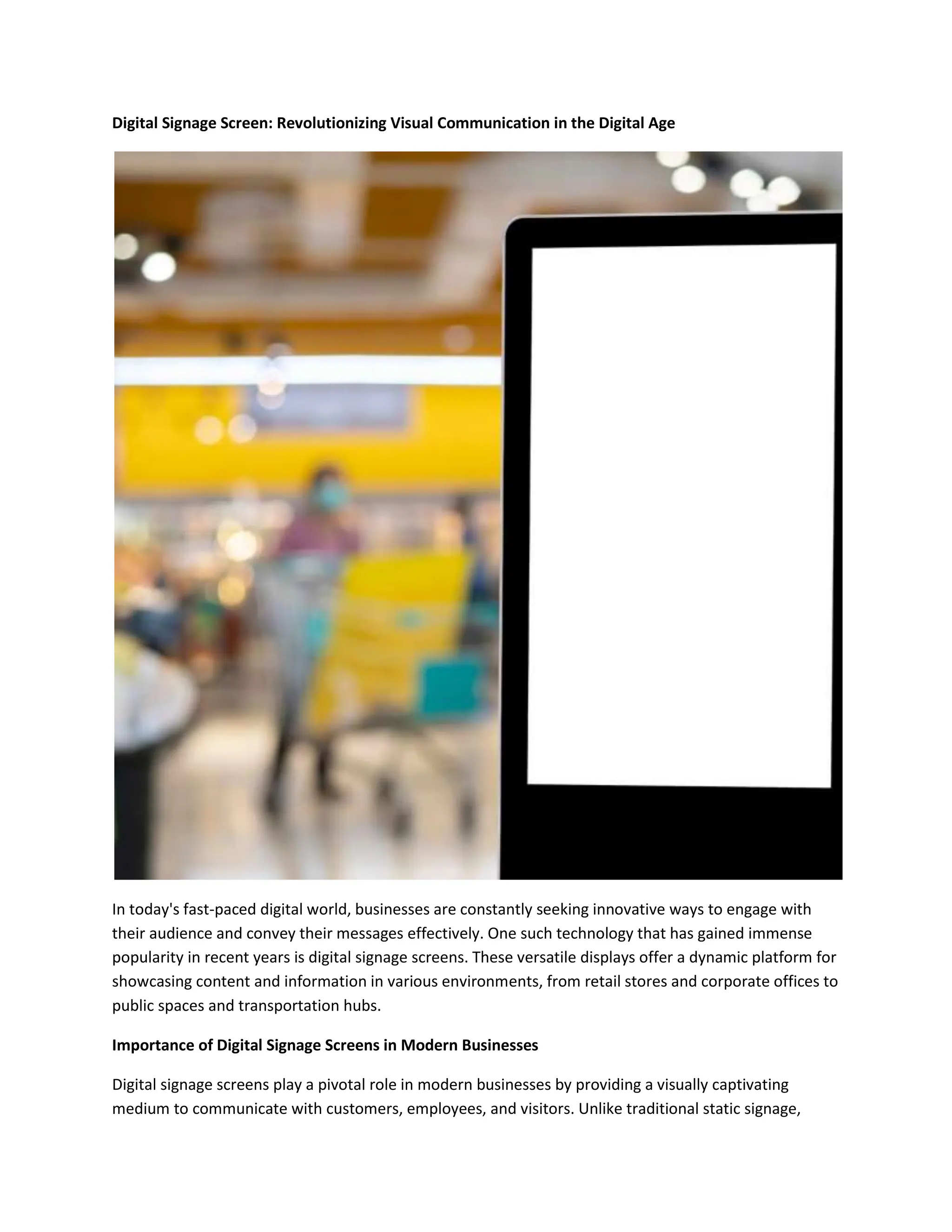 Digital signage screens are transforming visual communication for businesses by providing interactive and dynamic content delivery in various environments. They come in multiple types, including LCD, LED, and projection screens, each with unique features to enhance engagement and communication. Businesses can leverage digital signage for numerous applications such as retail, hospitality, healthcare, and education while also facing challenges like content management and security, necessitating effective implementation strategies.
