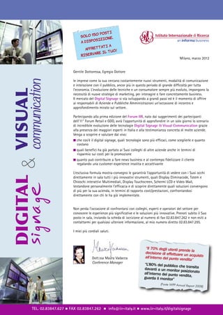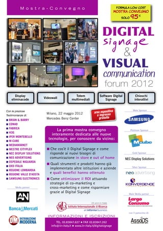 Il documento presenta un evento dedicato al digital signage e alla comunicazione visiva che si terrà a Milano il 22 maggio 2012, con la presenza di importanti esperti del settore e testimonianze di aziende che hanno implementato queste tecnologie. Durante il forum, i partecipanti avranno l'opportunità di approfondire le varie soluzioni, vantaggi e strategie per ottimizzare l'uso del digital signage, contribuendo al miglioramento dell'esperienza del cliente e al rafforzamento delle strategie di marketing. L'evento include anche sessioni di confronto tra colleghi e operatori per condividere esperienze e innovazioni.
