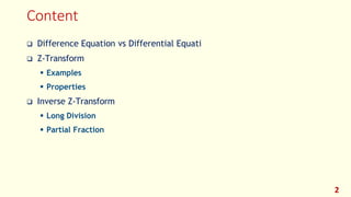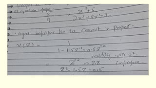 The document discusses the inverse z-transform in digital signal processing (DSP), contrasting difference equations with differential equations, and emphasizing the utility of z-transforms in solving linear time-invariant (LTI) systems. It details the method for obtaining the inverse z-transform via long division, partial fraction expansion, and other techniques, including examples illustrating these methods. Additionally, it provides comparisons between the Laplace transform and z-transform, clarifying their respective roles in continuous and discrete time analysis.