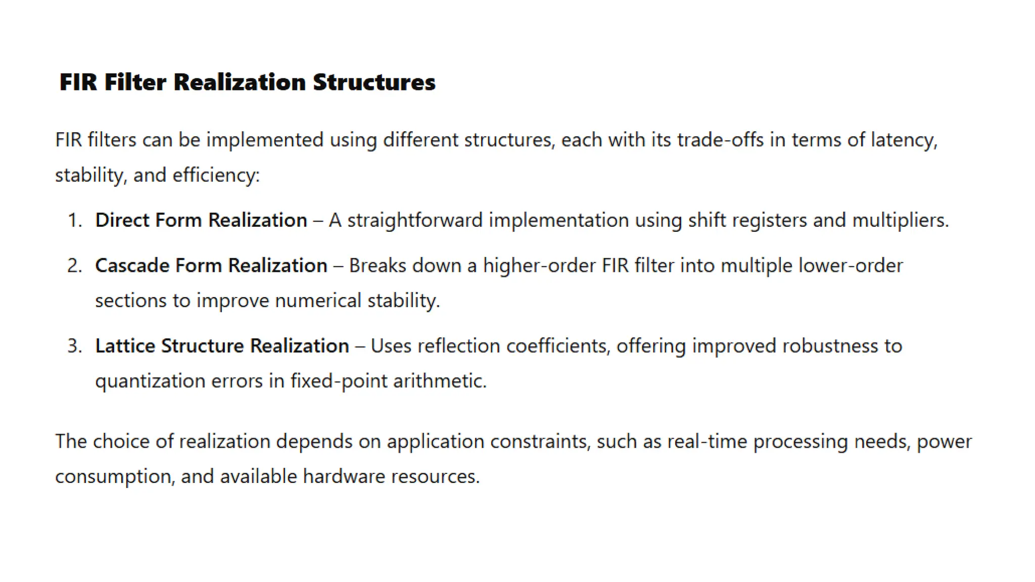 ● Longer Delay: Longer group delay compared to IIR filters.