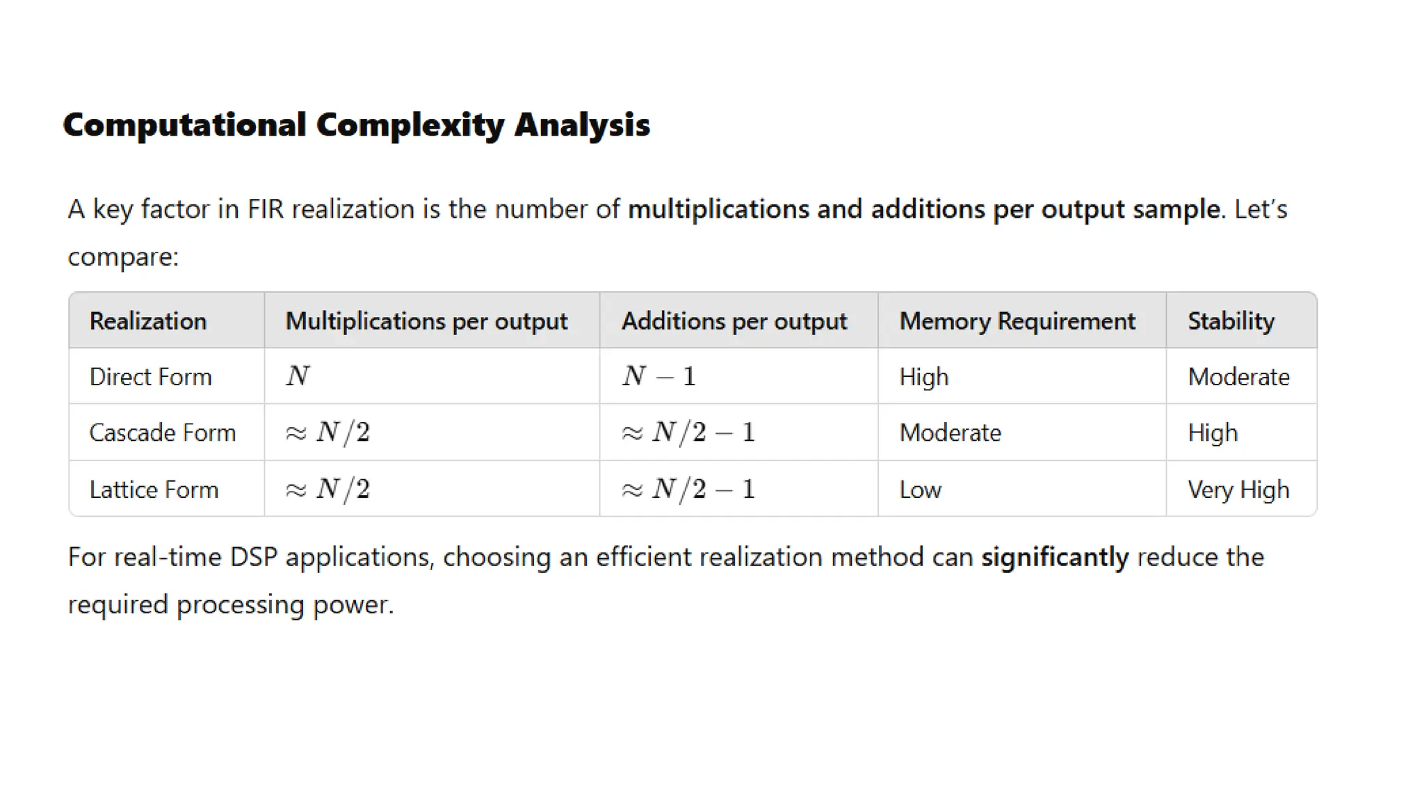● Memory Usage: More memory is used for storing the coefficients.