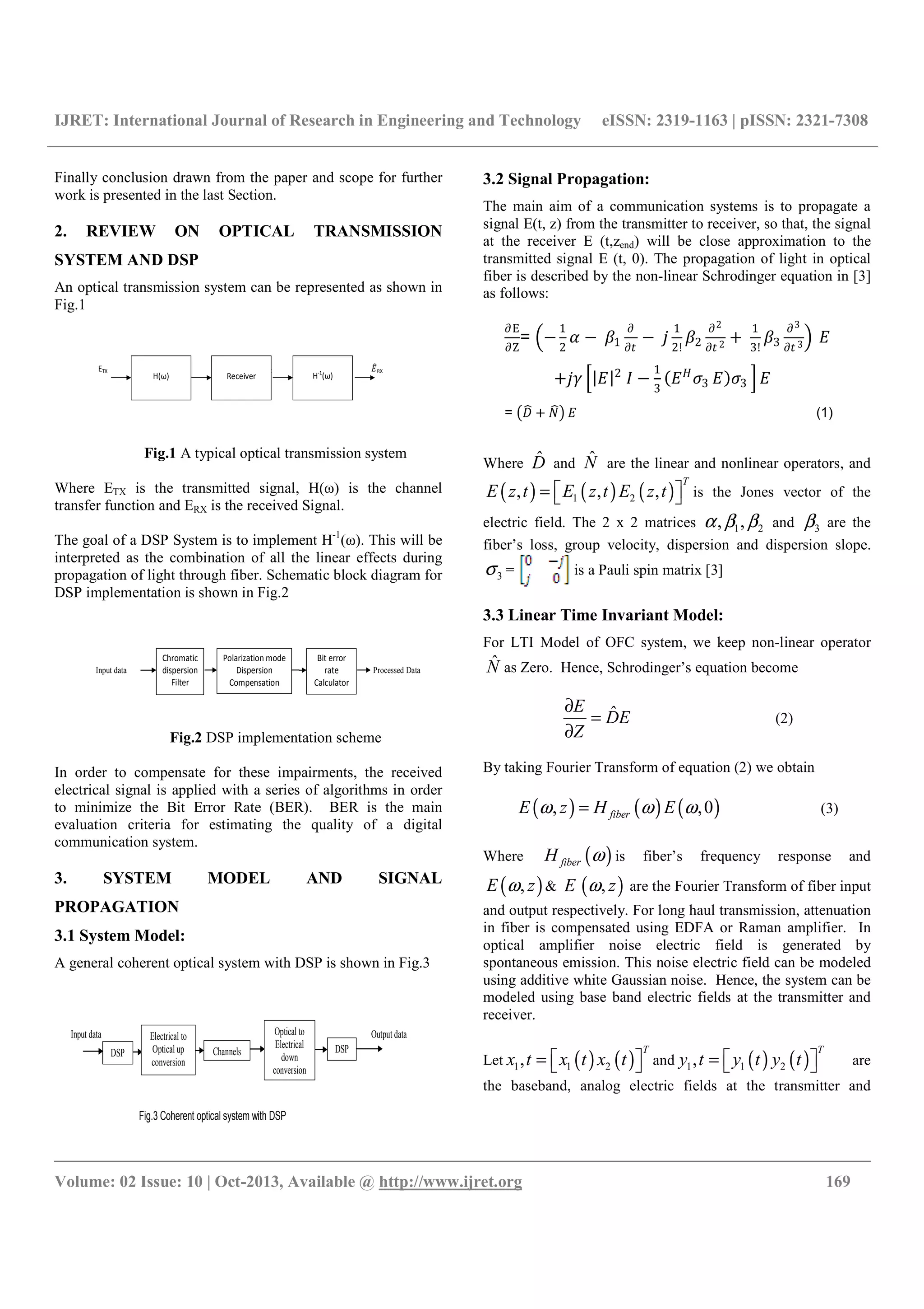 The document discusses digital signal processing (DSP) techniques for compensating linear time-invariant (LTI) fiber impairments like chromatic dispersion (CD) and polarization mode dispersion (PMD) in optical fiber communication. It outlines the advantages of DSP in improving data transmission quality and presents various algorithms for fiber impairment compensation in both time and frequency domains. The paper highlights the importance of coherent detection for future high-speed optical communication systems.