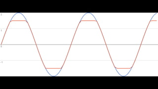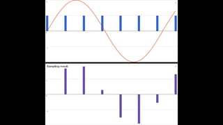 The document outlines digital signal processing techniques using JavaScript, focusing on mathematical manipulation of audio signals. It includes code snippets for audio buffer playback, processing, and image data manipulation, along with examples of quantization and compression. Additionally, references to various images and projects are provided to support the concepts discussed.