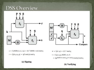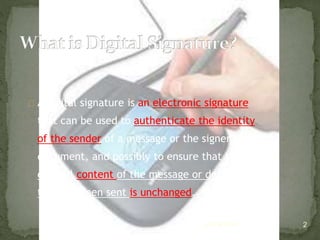A digital signature allows one to verify the identity of the sender of a message and that the message content has not been altered. It involves a key generation algorithm that produces a private key and public key pair. The signing algorithm uses the private key to generate a signature for a message. The signature verification algorithm uses the public key to verify the signature and authenticity of the message. Digital signatures provide security as long as the private key remains confidential to the owner.