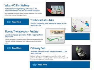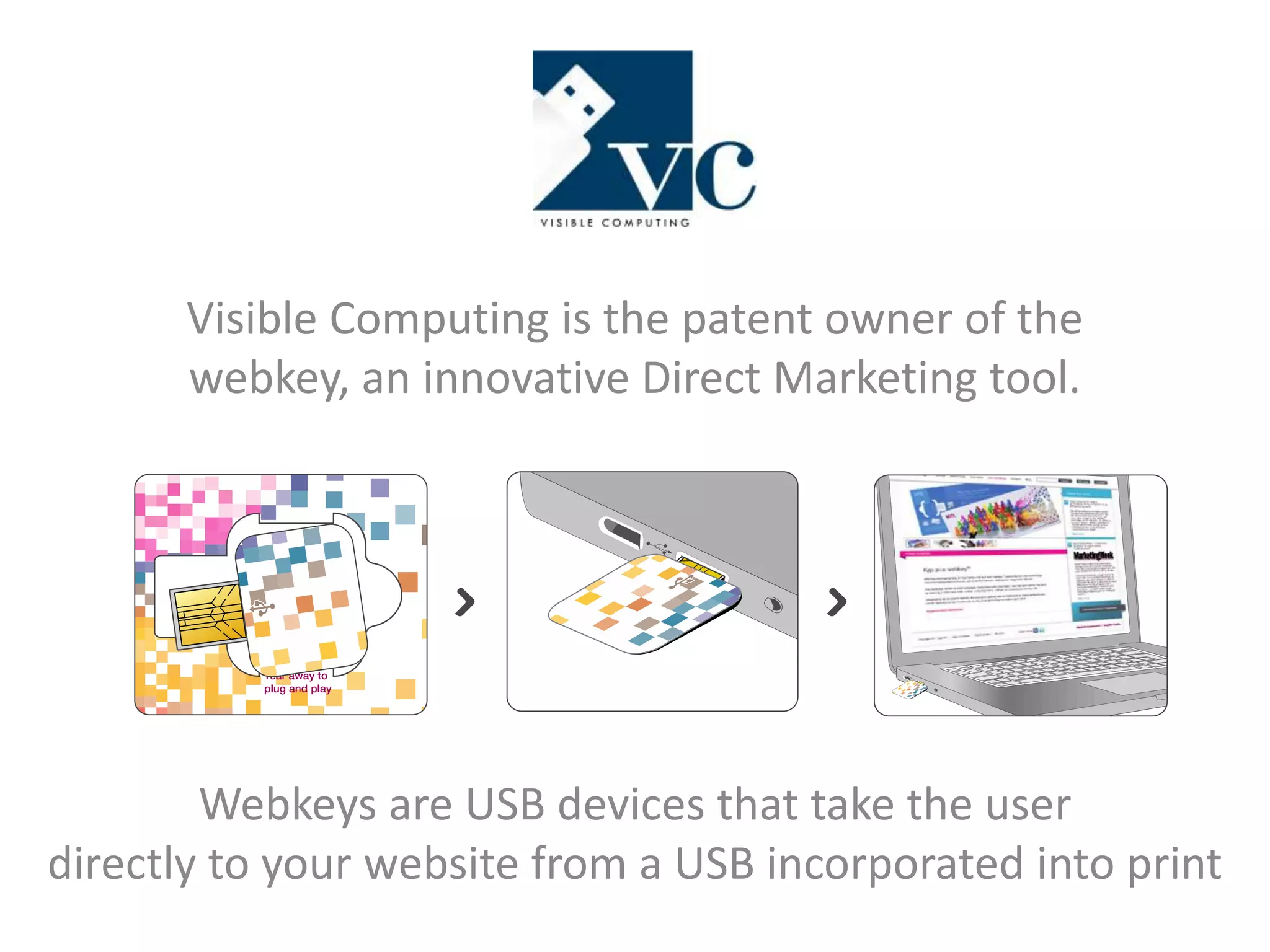 Visible Computing is the patent owner of webkeys, which are USB devices incorporated into printed materials that take users directly to a website. Each webkey allows its usage to be analyzed through cloud-based analytics dashboards. Webkeys consistently deliver 10-25% response rates for direct marketing campaigns, higher than traditional direct marketing response rates of 0.5-1.5%. Several case studies show webkeys delivering response rates over 10% for clients in various industries. The unique ID of each webkey also allows websites to personalize the user experience.