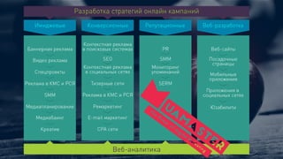 Документ описывает опыт и достижения в области интернет-маркетинга, включая 16 лет в маркетинге и 13 лет в digital. Он подчеркивает важность стратегического подхода к маркетингу, описывая ключевые концепции, такие как KPI, аналитика, планирование и интеграция цифровых каналов. Также документ затрагивает темы управления, команды и ресурсов, необходимых для успешного интернет-продвижения.