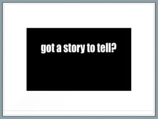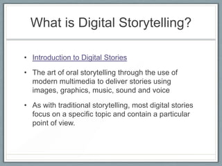 Digital storytelling involves using multimedia such as images, graphics, music and voiceovers to tell stories in a modern way. It can be used by teachers to engage students and introduce difficult topics, and by students to enhance skills like research, literacy and public speaking. Teachers are encouraged to have students create digital stories for a variety of subjects and grade levels using storyboarding and video editing software like iMovie. Copyright and student privacy must be considered when creating digital stories.