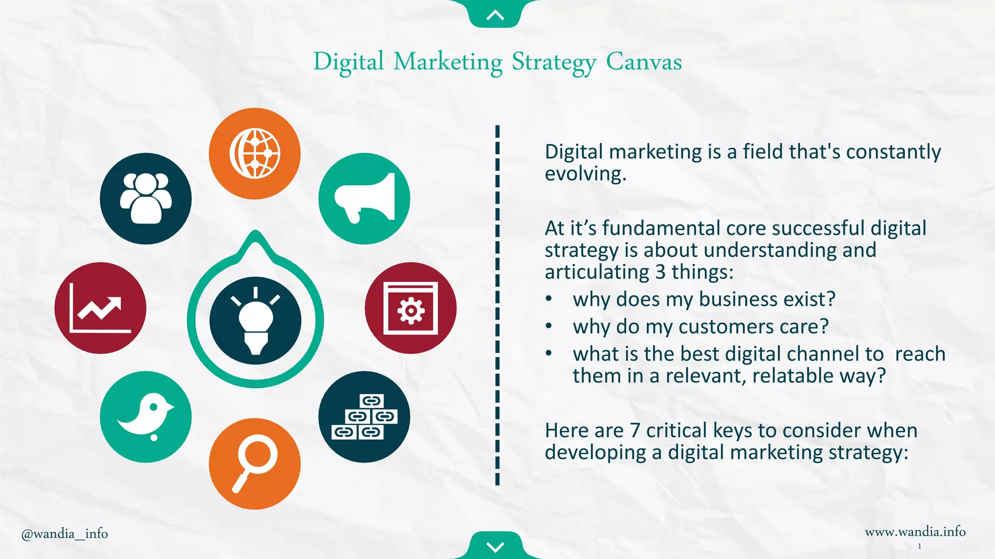 This document outlines seven critical keys to developing an effective digital marketing strategy: 1) Define business objectives and goals, 2) Describe your brand's key components, 3) Establish key performance indicators to track metrics, 4) Tell a compelling story that satisfies customer needs, 5) Develop a plan to acquire and engage users through relevant digital channels, 6) Define processes to activate and retain customers, and 7) Use data-driven decisions to segment, target, and track customer behavior across channels. The overall strategy should focus on understanding customers and reaching them through the most effective digital mediums.
