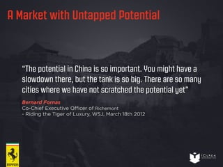 The document discusses Ferrari's digital strategy to tap into the growing luxury car market in China, emphasizing the brand's potential despite being ranked 23rd among luxury brands in the region. It highlights advertising trends, the importance of search engine marketing on platforms like Baidu, and various campaign strategies aimed at increasing sales among wealthy Chinese consumers. Additionally, it outlines specific initiatives to build brand awareness and drive audiences to Ferrari dealer locations.
