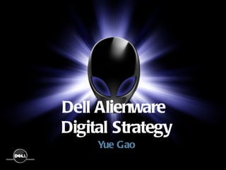 Dell's Alienware is currently Dell's premier gaming brand. The document outlines a digital strategy to promote Alienware by increasing its share of voice and extra share of voice through social media, internet marketing, mobile apps, and celebrity endorsements. The 6-month, $50,000 strategy includes campaigns themed "The Flames of War" and "Befriend Aliens" to engage target audiences of gamers aged 15-45 making over $50,000 annually. Performance will be evaluated based on social media followers, positive feedback, product sales, survey responses, and rewards redeemed. Budget may be adjusted if click-through rates fall below thresholds.