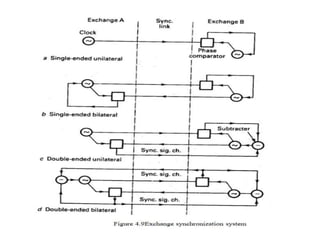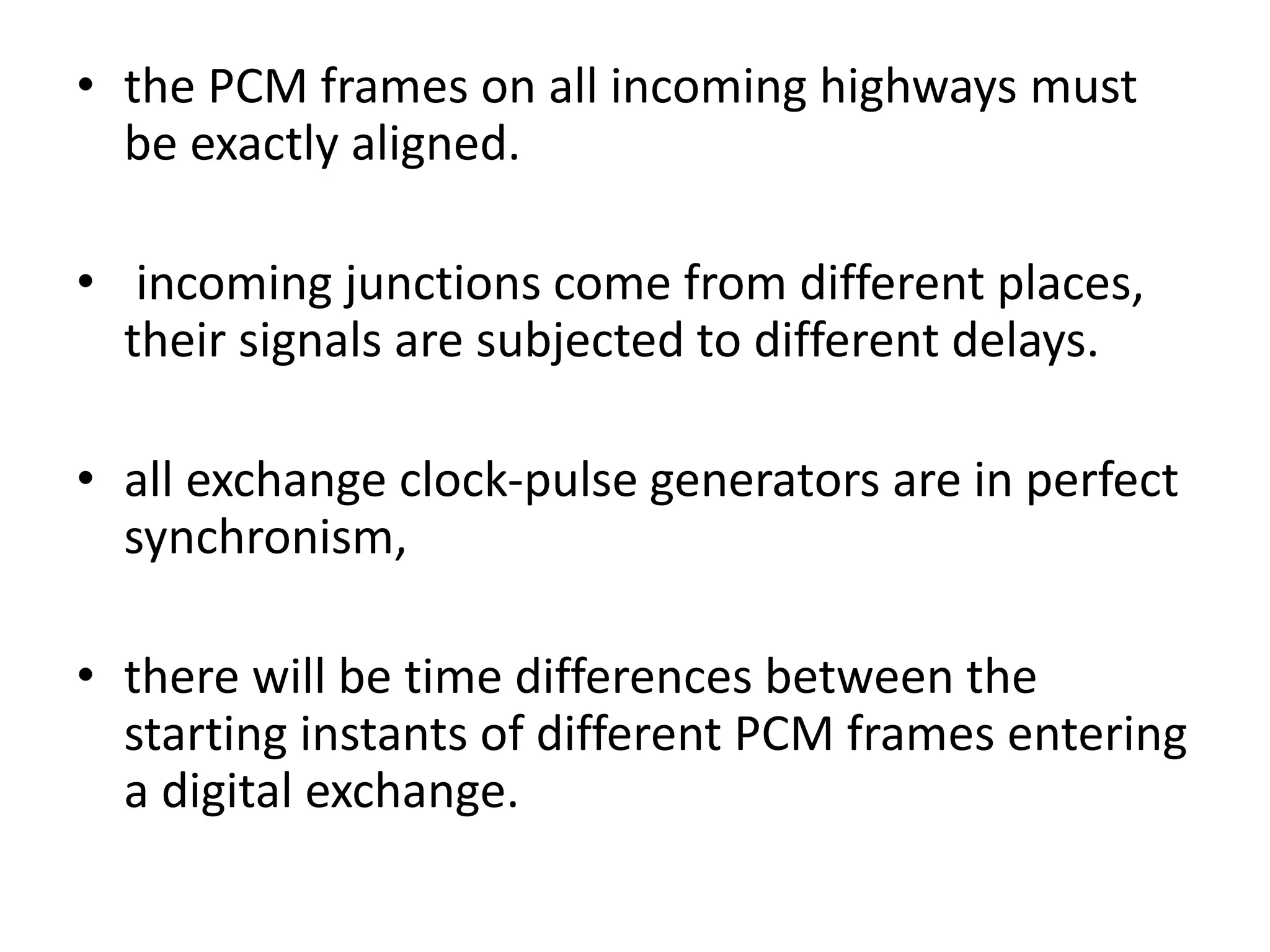 Frame alignment ensures that PCM frames from different sources entering a digital exchange are synchronized. A frame alignment buffer stores incoming digits and reads them out at the exchange clock rate to align frames. Synchronization networks use reference clocks to control exchange clocks and ensure frames are aligned across the entire network. Unilateral and bilateral synchronization links can control clock frequencies between two exchanges, while double-ended systems can distinguish between frequency drift and propagation delays better than single-ended systems. An integrated digital network uses a synchronizing auxiliary network to link all exchanges.