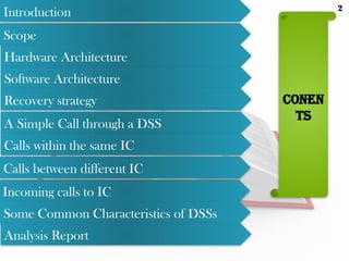 The document outlines the comprehensive architecture of a generic digital switching system (DSS), detailing its hardware and software components, recovery strategies, and call processing methods. It emphasizes the roles of various processors, including central and network control processors, in managing call paths and system functionalities, alongside a breakdown of recovery strategies during failures. Additionally, it discusses the characteristics of digital switching systems, their capabilities, and maintenance processes.