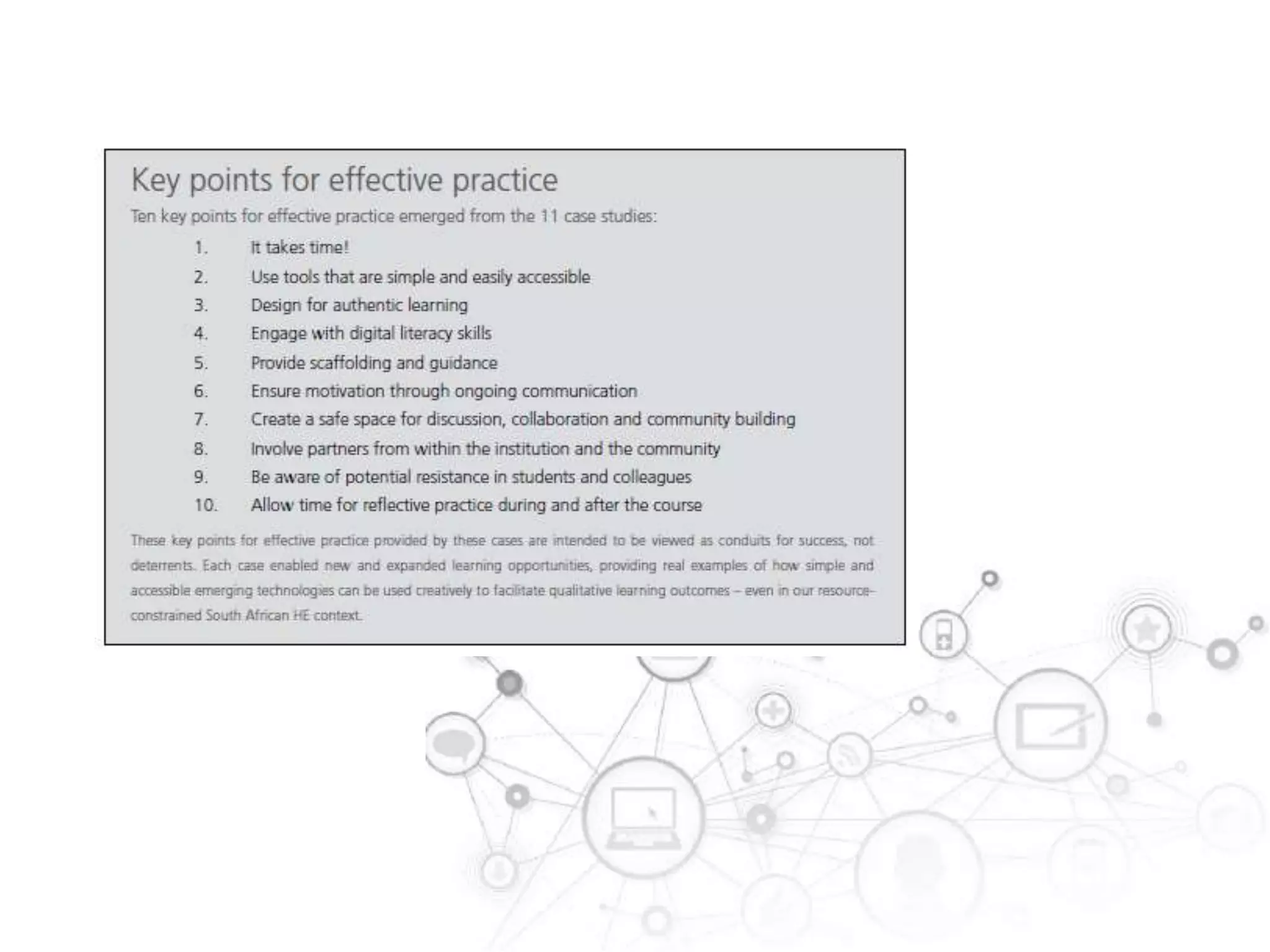 This document discusses the use of digital technologies in the classroom and how they can enhance learning. It notes that today's students have grown up with technologies like computers, cell phones and the internet as integral parts of their lives. As a result, three shifts are needed: from education to learning, from information consumption to participatory learning, and from institutions to networks. Emerging technologies like social media, online collaboration tools, and mobile devices allow learning to take place anywhere and empower students to create and share knowledge. However, institutions and policies have been slow to fully adopt and implement these technologies. The document advocates embracing technologies to provide meaningful, connected learning experiences for students.