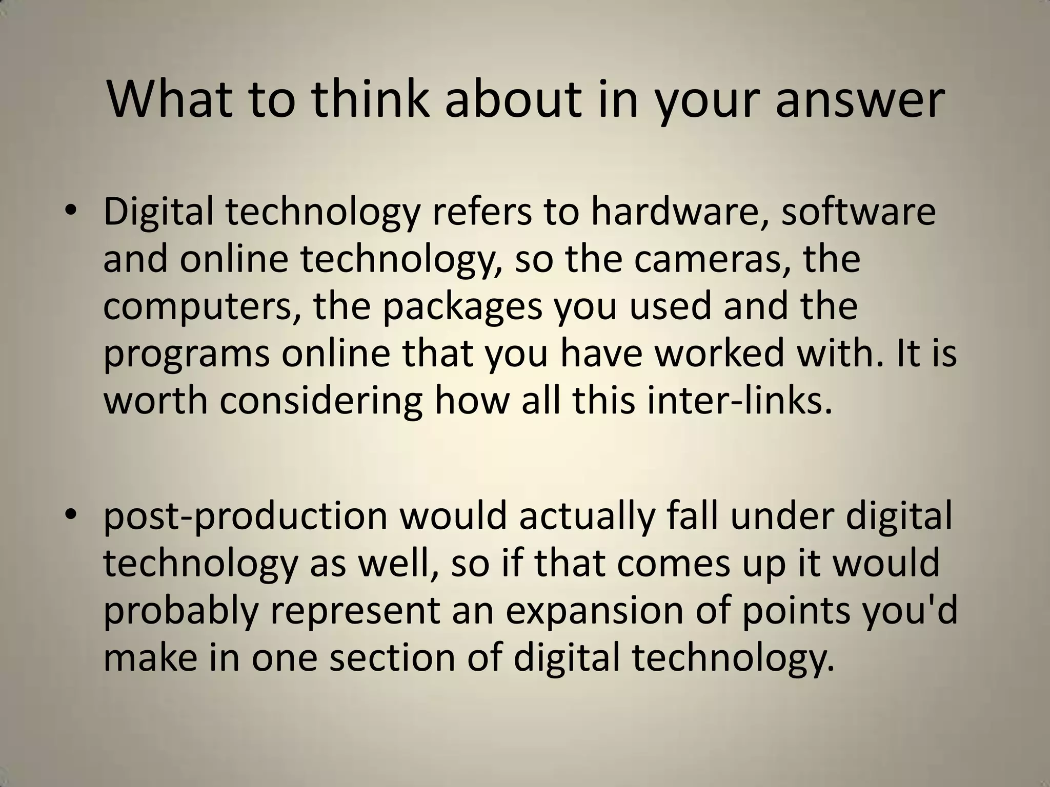 Digital technology refers to hardware, software, and online tools used for production and post-production. It is important to consider how these aspects interlink. Post-production falls under digital technology and involves manipulating raw materials like photos and video using tools like Photoshop and video editing software.