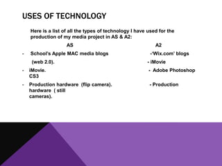 The document discusses the technology used by the author for their media project from AS to A2 levels. In AS, the author used the school's MAC blogs and iMovie software. For A2, the author used Wix blogs for more customization options, iMovie, Adobe Photoshop, and Canon HD video cameras. The author notes the A2 hardware and software allowed for more advanced editing, manipulation, and presentation skills compared to AS.