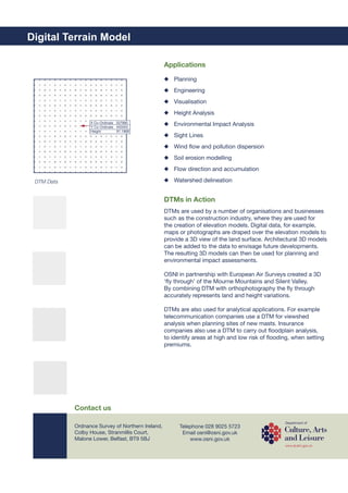 A Digital Terrain Model (DTM) is a digital file that provides a detailed 3D representation of the topography of the Earth's surface. It consists of terrain elevations at regularly spaced intervals that can be used to create 3D visualizations and analyze slope, aspect, height, and other topographical features. DTMs with draped aerial imagery can help with planning, engineering, and environmental impact assessments by providing accurate 3D models of land surfaces. They are used across a variety of industries and applications.