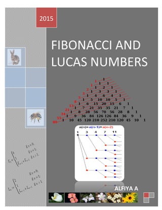 This document is about Fibonacci and Lucas numbers. It begins with an introduction to the Fibonacci sequence and how it relates to a rabbit breeding problem. It then defines the Fibonacci sequence recursively and provides Binet's formula for calculating individual Fibonacci numbers. It also introduces the Lucas sequence, which is similar but begins with different starting values. The bulk of the document covers several important identities involving Fibonacci and Lucas numbers, including Lucas' identity relating sums of early Fibonacci numbers to later ones, Cassini's formula involving differences of Fibonacci numbers, and others. It proves these identities through recurrence relations and mathematical induction.