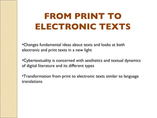 The document discusses the translation of texts from print to electronic formats. It explores how this transition changes fundamental ideas about texts and requires examining both print and electronic texts with new perspectives. The meaning derived from texts can vary across mediums as electronic versions involve additional elements like graphics and interactivity that affect the reading experience compared to print. While the ink in print is stable, electronic texts on screens can change each time they are viewed, making the meaning derived from them less fixed.