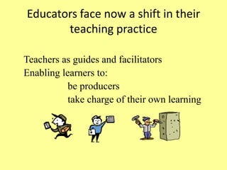 Educators now guide students to take charge of their own learning by enabling them to be producers. Teachers facilitate opportunities for natural communication, authenticity, and engagement through interaction. Through collaboration, students learn actively from peers in classes, groups, and communities by sharing tasks and cooperating rather than competing. Having an audience through posting messages or discussions online motivates students and gives them a sense of their work being read publicly beyond just the teacher.