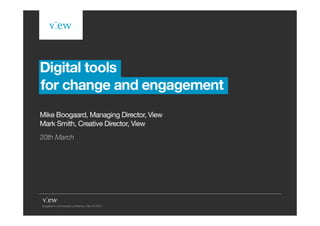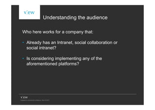 The document discusses how companies are using intranets, social intranets, and social collaboration platforms. It provides examples of how some companies are using these tools to support change and engagement within their organizations. The document also discusses the benefits these digital tools can provide, such as managing change, engaging employees, adapting to new generations, and measuring success through more efficient information sharing and expertise retention.
