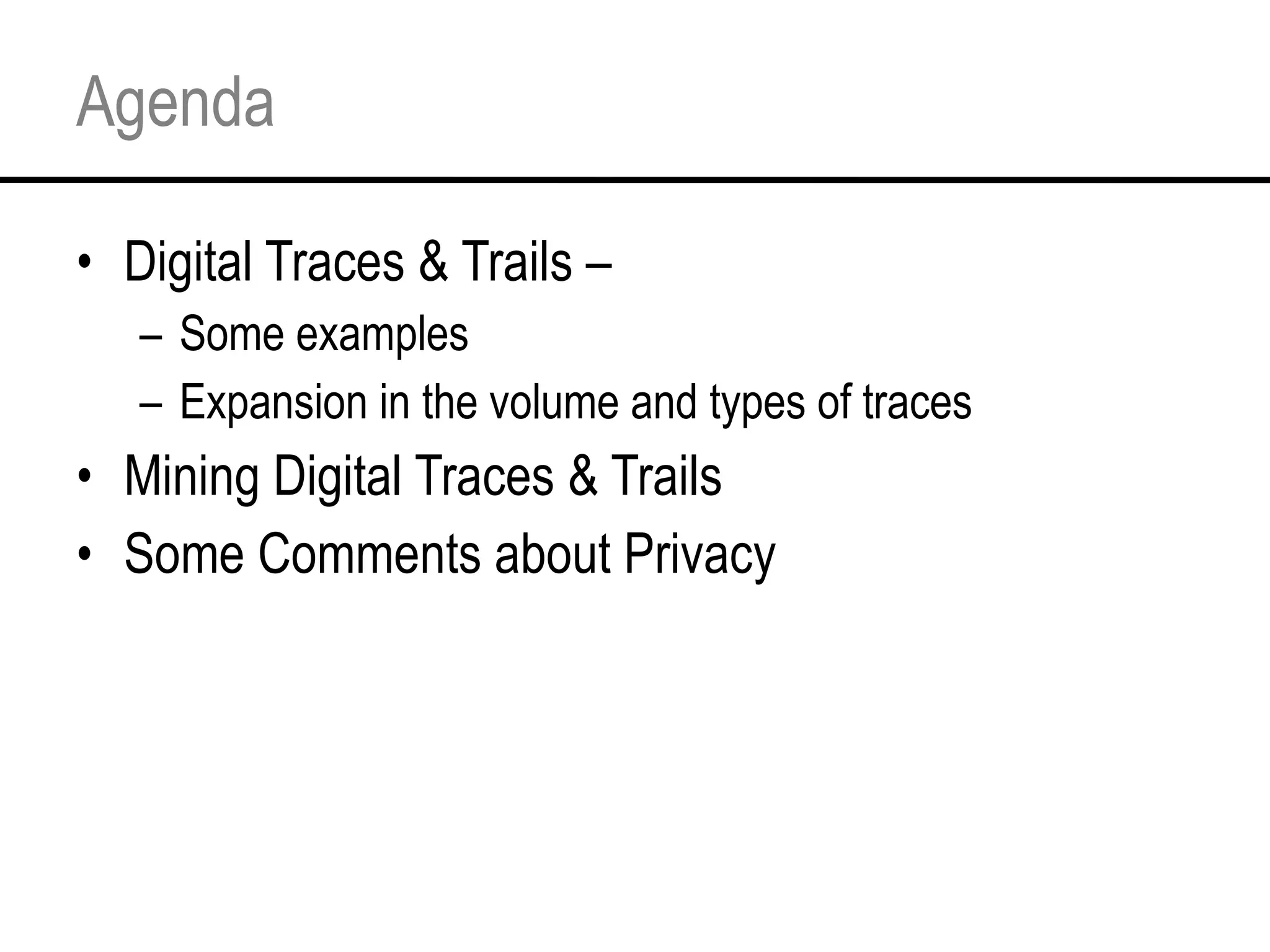 This document provides an overview and agenda for a tutorial on extracting intelligence from digital traces and trails left by web and mobile users. It discusses the proliferation of digital devices that create extensive data about people's online and mobile activities. Examples are given of different types of digital traces, including cookies, web bugs, location data, and social media interactions. Concerns about privacy are also mentioned as vast amounts of personal data are now collected and analyzed.