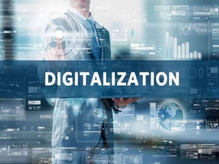 The document discusses digital transformation and automation/robotics. It defines digital transformation as using digital technologies to change business models and provide new revenue opportunities. It then discusses the evolution of digital transformation and how it is becoming pervasive across industries. It also discusses automation, different types of automation including fixed, programmable and flexible automation. Flexible automation involves both hardware and software and includes robotics. The document then discusses definitions, classifications, applications and the future of robotics.
