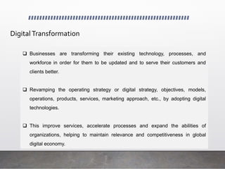 Businesses are transforming their existing technology, processes, and workforce through digital transformation to better serve customers. This involves revamping strategies, operations, products, and services by adopting digital technologies. Digital transformation improves services, accelerates processes, and expands organizational abilities, helping maintain relevance and competitiveness in the global digital economy.