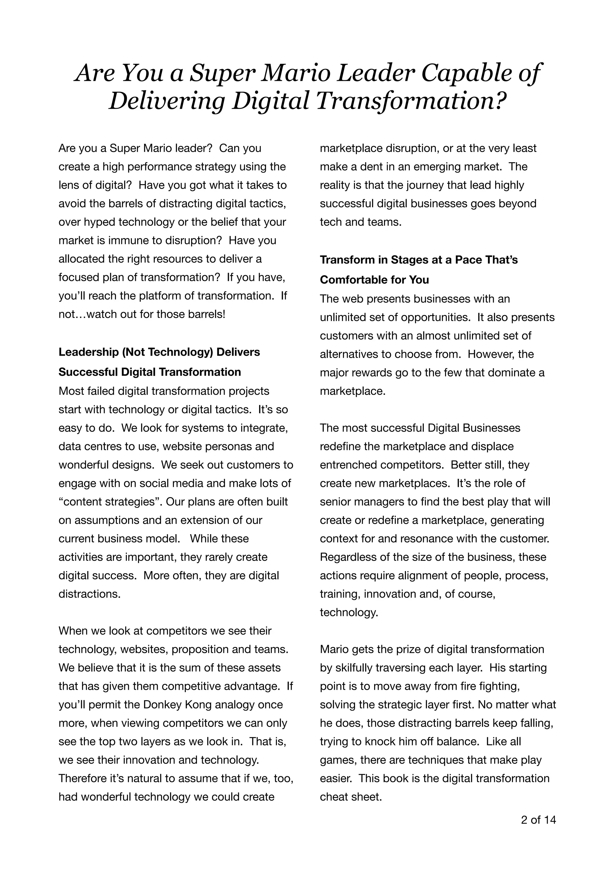 The document provides guidance on delivering successful digital transformation through leadership. It emphasizes that leadership, not technology, delivers transformation. It outlines a step-by-step approach including developing a digital business strategy focused on customers and markets. It stresses the importance of culture, people alignment, education to fill skills gaps, and agile innovation to solve business challenges. The goal is to redefine markets and displace competitors through constant innovation.