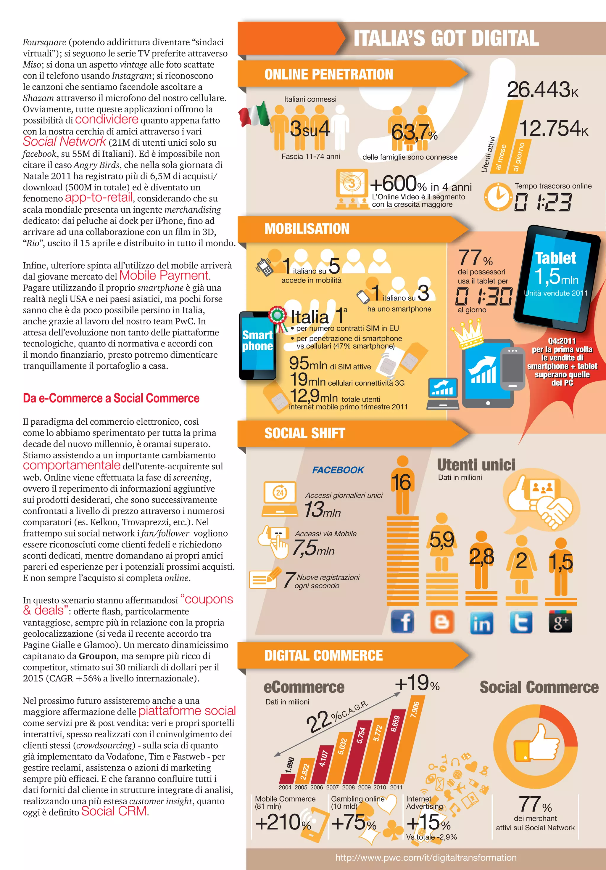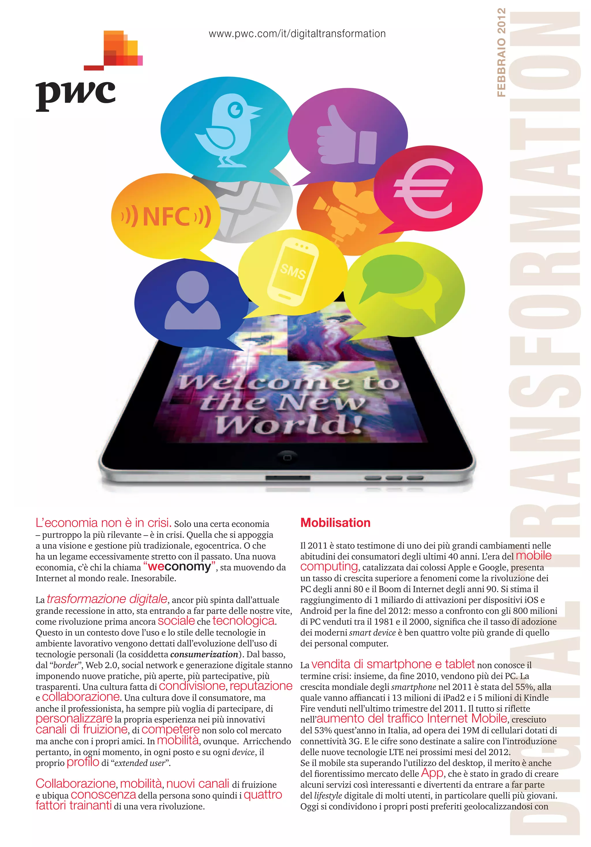 Il documento analizza l'impatto della trasformazione digitale nel 2011, evidenziando come il mobile computing abbia superato l'uso dei PC e abbia cambiato le abitudini dei consumatori. Si sottolinea la crescita esplosiva del mercato degli smartphone e delle applicazioni, insieme a una nuova economia basata sulla collaborazione e sulla condivisione. Infine, viene sottolineata l'importanza della digitalizzazione per le imprese, che devono adeguarsi ai nuovi modelli di business e aspettative dei consumatori.