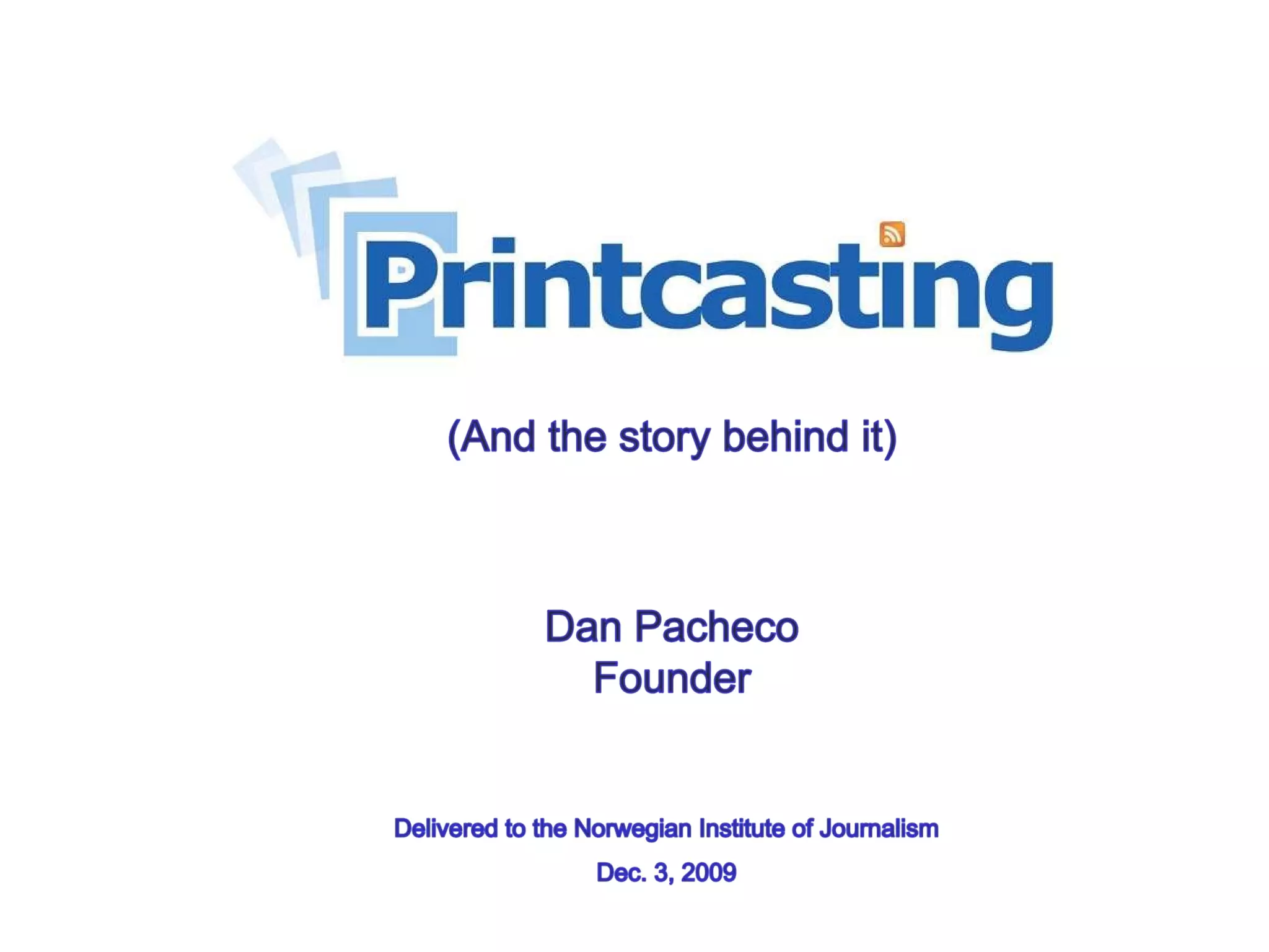 Printcasting is a Knight News Challenge project that allows anyone to easily create printable magazines by leveraging digital content without needing design skills or software. Users can select or create their own content, include ads which can be placed for as little as $10, and Printcasting will automatically generate a printable magazine and corresponding website. This democratizes the print publishing process and helps blogs and communities connect with local audiences through printed content that is also optimized for online and mobile viewing. The project has seen success with hyperlocal publishers and is now partnering internationally to expand its reach.