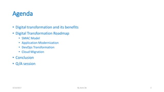 This document discusses digital transformation through application modernization, DevOps, and cloud migration. It outlines a digital transformation roadmap including assessing maturity, analyzing gaps, and implementing a plan. The SMAC model of social, mobile, analytics, and cloud is presented as an approach to improve customer engagement. Application modernization, DevOps benefits like faster delivery and quality, and cloud migration benefits like flexibility and cost effectiveness are also summarized. The conclusion emphasizes that digital transformation is necessary for organizations to successfully enhance customer experience in today's digital world.